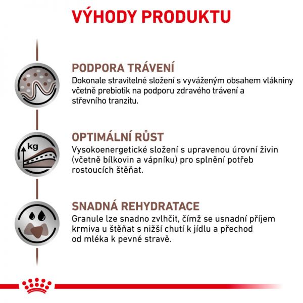 A gyomorrontásban szenvedő kölykök nagyon gyengék lehetnek, és csökkent étvágyuk és/vagy nyugtalanságuk lehet. A kibble-t (méret, textúra és forma) úgy tervezték, hogy könnyen rehidratálható legyen, így a kölykök könnyebben tudják megenni.